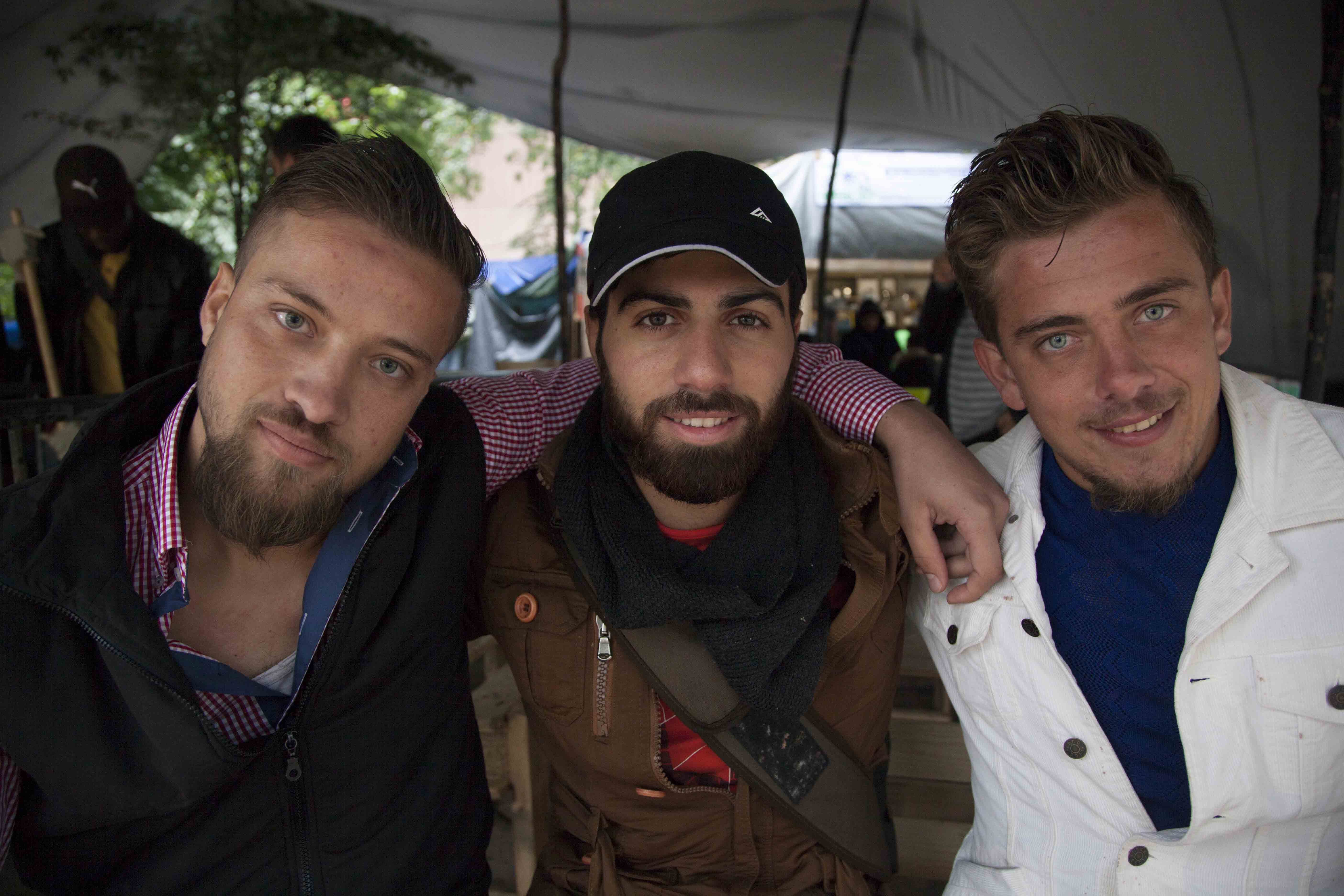 Yaser, Ibrahim en Ahmed (v.l.n.r.), komen uit Aleppo in Syrië en kennen elkaar van de universiteit. Ze waagden hun leven in de lange reis naar Europa en vonden elkaar in Brussel terug. Yasers jongere broer, Ahmed (rechts), kwam pas deze week aan.