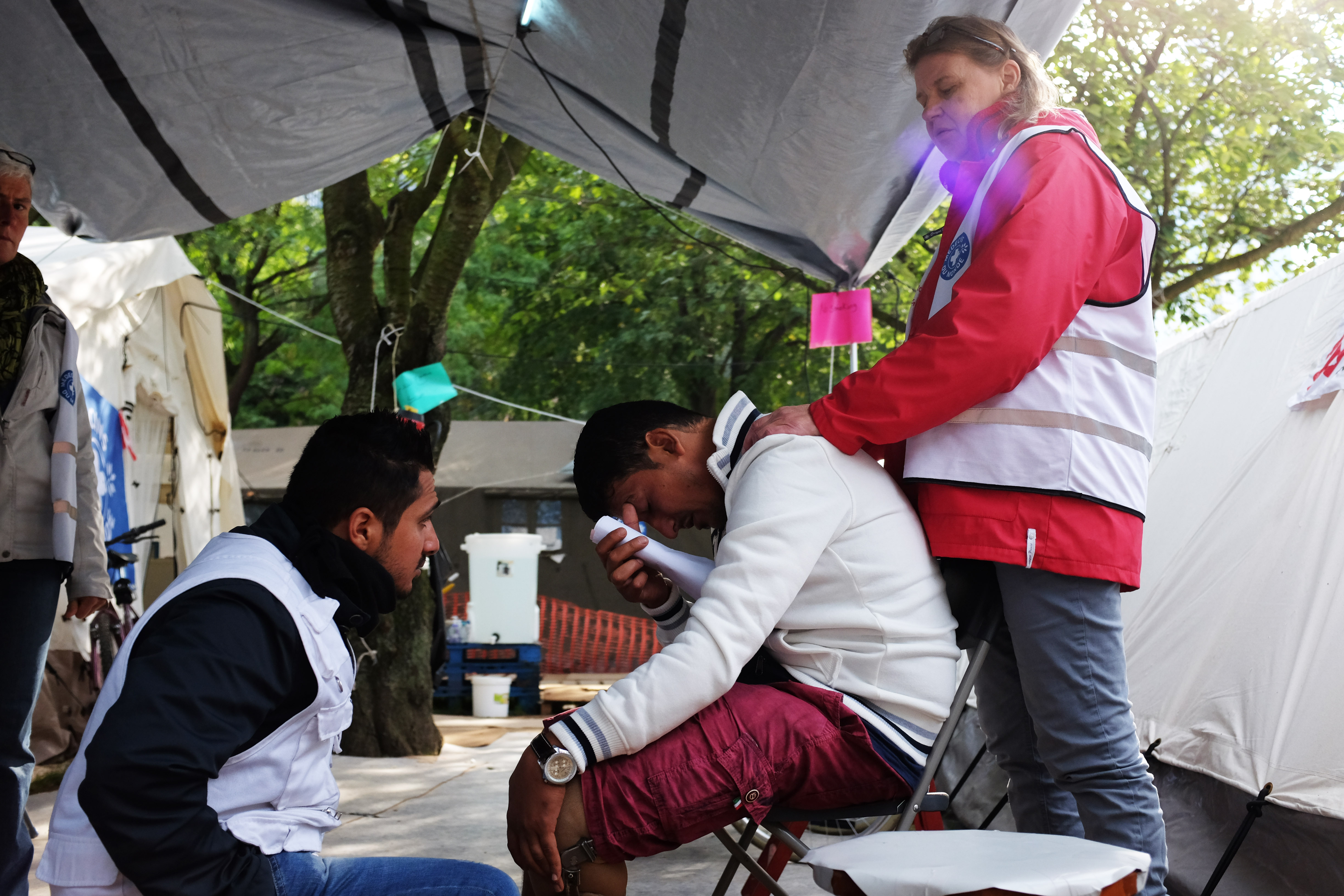 Hij mankt onder een spandoek door. In fluo oranje letters op zwarte stof staat ‘welcome aboard’. Vier meter verder gaat hij zitten op een van de acht klapstoeltjes onder een grijs zeiltje. Samen vormen ze de geïmproviseerde wachtzaal van het veldhospitaal van Dokters van de Wereld. De grond is bedekt met kartonnen flappen. Het park rondom heeft nog het meeste weg van de weide van een muziekfestival na dagenlange regen. Hier speelt geen muziek op de achtergrond, alleen het getoeter van ongeduldige Brusselse autobestuurders rond het Noordstation.